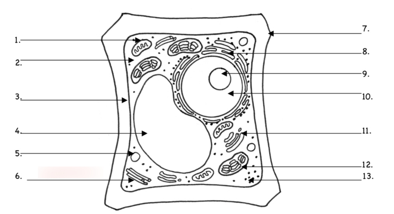 Hình sau mô tả cấu trúc đơn giản của một tế bào thực vật điển hình với một số cấu trúc được đánh số từ (1) đến (13). Hãy quan sát và điền mã trả lời (chỉ điền một chữ số vào bảng).