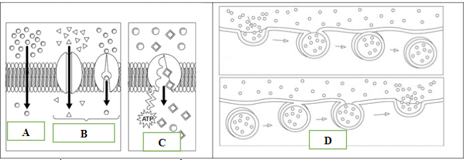 Hình vẽ sau cho thấy sự vận chuyển các chất qua màng: Hãy cho biết các hình thức vận chuyển