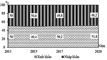 Cho biểu đồ về giá trị xuất, nhập khẩu của nước ta, giai đoạn 2013 - 2020: (Số liệu theo