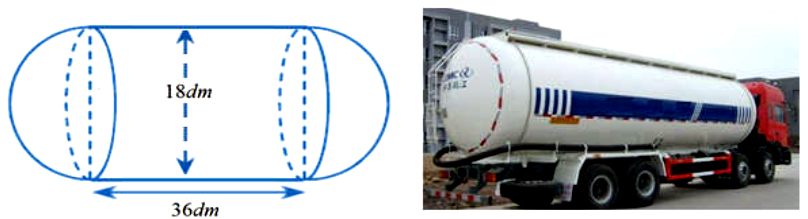 Một xe bồn chở nước có bồn nước gồm hai nửa hình cầu đường kính \(18{\rm{dm}}\) và một hình trụ có chiều cao \(36{\rm{dm}}\) (như hình vẽ). Thể tích của bồn đã cho bằng