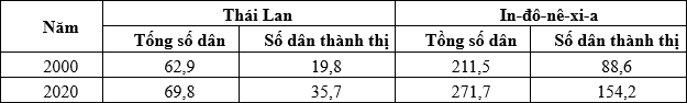 Cho bảng số liệu: TỔNG SỐ DÂN, SỐ DÂN THÀNH THỊ CỦA THÁI LAN VÀ IN-ĐÔ-NÊ-XI-A, NĂM 2000 VÀ