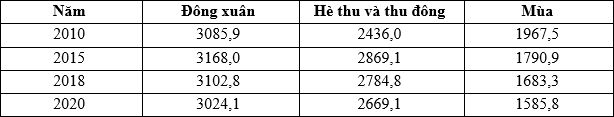 Cho bảng số liệu: DIỆN TÍCH LÚA PHÂN THEO MÙA VỤ Ở NƯỚC TA, GIAI ĐOẠN 2010 - 2020 (Đơn vị: