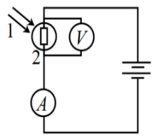 Trong sơ đồ hình vẽ bên, chiếu chùm sáng (1) vào quang trở (2) thì ampe kế (A) và vôn kế (V) chỉ giá trị xác định. Nếu tắt chùm sáng (1) thì