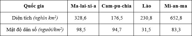 Cho bảng số liệu: DIỆN TÍCH VÀ MẬT ĐỘ DÂN SỐ CỦA MỘT SỐ QUỐC GIA NĂM 2020 Theo bảng