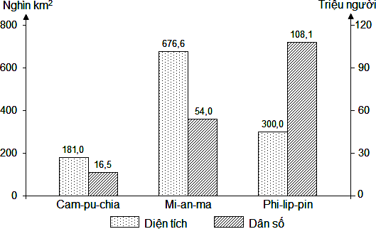 Cho biểu đồ: DIỆN TÍCH VÀ DÂN SỐ NĂM 2019 CỦA MỘT SỐ NƯỚC (Số liệu theo Niên giám thống