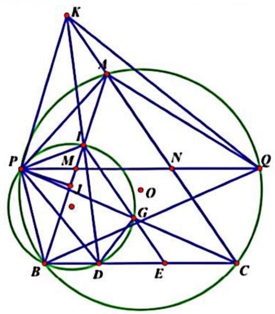 Cho tam giác nhọn \({\rm{ABC}}({\rm{AB}} < {\rm{AC}})\) nội tiếp đường tròn \(\left( {\rm{O}} \right)\). Gọi \({\rm{M}},{\rm{N}}\) lần lượt là trung điểm của các cạnh \({\rm{AB}},{\rm{AC}}\) Đường thẳng \({\rm{MN}}\) cắt \(\left( {\rm{O}} \right)\) tại các điểm \({\rm{P}},{\rm{Q}}({\rm{P}}\) thuộc cung nhỏ và \({\rm{Q}}\) thuộc cung nhỏ . Lấy điểm \({\rm{D}}\) trên cạnh \({\rm{BC}}\left( {{\rm{D}} \ne {\rm{B}};{\rm{D}} \ne {\rm{C}}} \right)\). Đường tròn ngoại tiếp tam giác \({\rm{BDP}}\) cắt \({\rm{AB}}\) tại điểm \({\rm{I}}\) ( \({\rm{I}}\) khác \({\rm{B}}\) ). Đường thẳng \({\rm{DI}}\) cắt \({\rm{AC}}\) tại \({\rm{K}}\).
