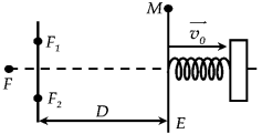Trong thí nghiệm giao thoa ánh sáng bằng khe Young, khe hẹp F được chiếu ánh sáng đơn sắc. Màn quan sát là một tấm phẳng khối lượng m = 200g được gắn vào một đầu lò xo có độ cứng k = 20N/m. Tại vị trí cân bằng, mặt phẳng chứa 2 khe cách màn 1m. Tại thời điểm t = 0, cung cấp cho màn vận tốc v0 = 2m/s theo hướng ra xa hai khe từ vị trí cân bằng để màn dao động điều hòa theo phương ngang. Tại điểm M trên màn ban đầu là vân sáng bậc 6. Từ thời điểm t = 0, M trở thành vân tối lần thứ 4 vào thời điểm