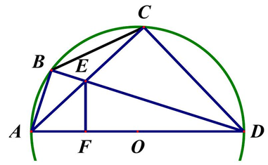 (1,0 điểm) Trên nửa đường tròn đường kính \(AD\) lấy hai điểm \(B,C\) phân biệt sao cho \(B\) ở giữa \(A\) và \(C\) ( \(B\) khác \(A\) và \(C\) khác \(D\) ). Gọi \(E\) là giao điểm của \(AC\) và \(BD;F\) là chân đường vuông góc kẻ từ \(E\) xuống \(AD\). Chứng minh rằng: