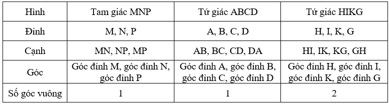 Lần lượt nêu tên đỉnh cạnh góc của mỗi hình, sau đó dùng ê-ke để xác định góc vuông.