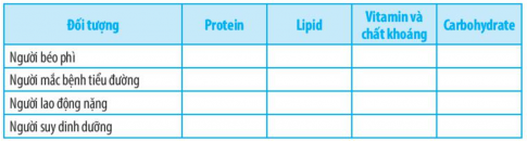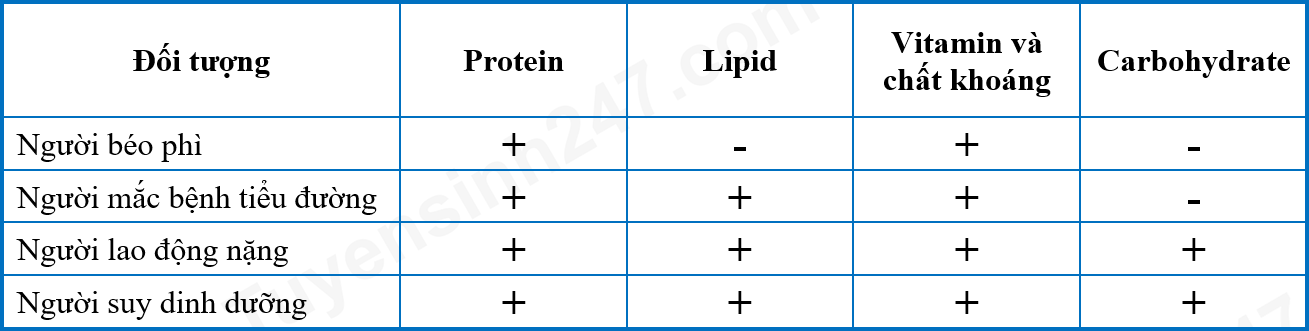 Em hãy cho biết những đối tượng trong bảng bên dưới cần cung cấp (+) hay cần hạn chế (-) ăn những loại thức ăn giàu các nhóm chất sau đây.