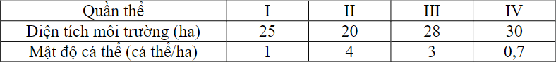 Mỗi quần thể sinh vật thuộc loài A có kích thước tối thiểu là 25 cá thể. Người ta thống kê 4 quần thể của loài này ở các môi trường ổn định khác nhau, thu được kết quả như sau: