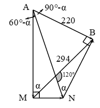 Cho đoạn mạch AB gồm AM chứa tụ điện, MN chứa điện trở R và NB chứa cuộn cảm. Đặt vào hai đầu AB điện áp xoay chiều \({u_{AB}} = 220\sqrt 2 \cos \left( {100\pi t} \right)\,\,\left( V \right)\) thì điện áp hiệu dụng trên đoạn MB là 294 V. Biết điện áp tức thời trên đoạn mạch MB sớm pha \(\dfrac{{2\pi }}{3}\) so với điện áp tức thời trên đoạn mạch AN; điện áp tức thời trên đoạn mạch NB lệch pha \(\dfrac{\pi }{2}\) so với điện áp tức thời trên đoạn mạch AB. Điện áp hiệu dụng trên đoạn mạch MN có giá trị gần nhất với giá trị nào sau đây?