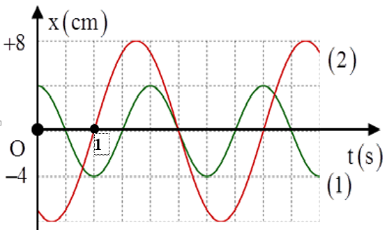 Hai chất điểm dao động điều hòa trên hai trục tọa độ song song nhau, gần nhau coi như trùng nhau và cùng gốc tọa độ O, đồ thị li độ theo thời gian như hình bên. Tại thời điểm \({t_0} = 0\) chất điểm (1) đang ở vị trí biên. Khoảng cách giữa hai chất điểm tại thời điểm t = 5,9 s gần nhất với giá trị nào sau đây?