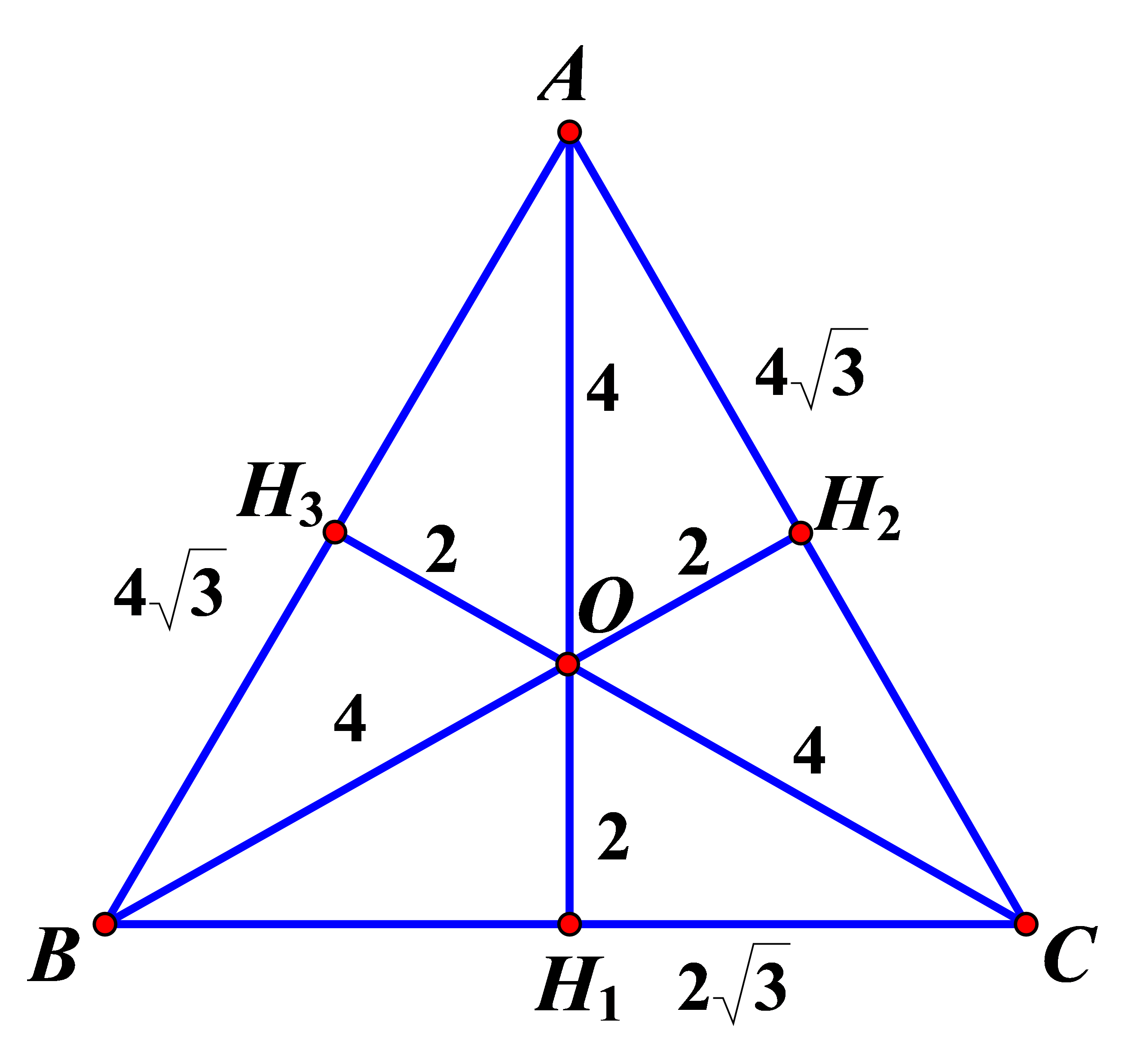 Trên mặt nước rộng, một nguồn sóng điểm đặt tại O dao động điều hòa theo phương thẳng đứng tạo ra sóng cơ lan truyền trên mặt nước với bước sóng 1cm. Xét tam giác đều thuộc mặt nước với độ dài mỗi cạnh là \(4\sqrt 3 \,\,cm\) và trọng tâm là O. Trên mỗi cạnh của tam giác này số phần tử nước dao động cùng pha với nguồn là