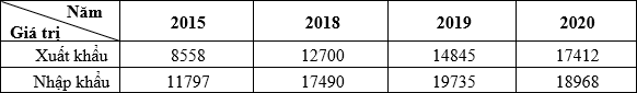 Cho bảng số liệu: GIÁ TRỊ XUẤT KHẨU, NHẬP KHẨU CỦA CAM-PU-CHIA, GIAI ĐOẠN 2015 - 2020 (Đơn
