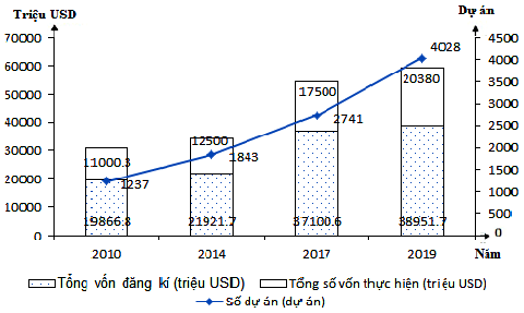 Cho biểu đồ về số vốn và số dự án đầu tư nước ngoài được cấp giấy phép ở Việt Nam giai đoạn 2010 - 2019
