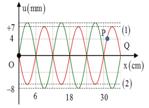Trên sợi dây OQ căng ngang, hai đầu cố định đang có sóng dừng với tần số f xác định. Hình vẽ mô tả hình dạng sợi dây tại thời điểm t1 (đường 1), \({t_2} = {t_1} + \dfrac{1}{{6f}}\)(đường 2) và P là một phần từ trên dây. Tỉ số tốc độ truyền sóng trên dây và tốc độ dao động cực đại của phần tử P bằng