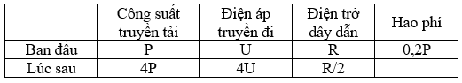 Điện năng được truyền tải từ nhà máy đến nơi tiêu thụ. Ban đầu công suất truyền tải là P thì hiệu suất của quá trình truyền tải là 80%. Coi hệ số công suất của mạch truyền tải luôn được giữa bằng 1. Nếu người ta giảm điện trở của dây dẫn xuống một nửa và lắp một máy tăng áp với hệ số tăng áp k = 4 trước khi truyền đi đồng thời tăng công suất truyền tải lên gấp 4 lần thì hiệu suất của quá trình truyền tải là