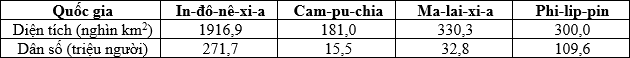 Cho bảng số liệu: DIỆN TÍCH VÀ DÂN SỐ CỦA MỘT SỐ QUỐC GIA ĐÔNG NAM Á NĂM 2020 (Nguồn: Niên