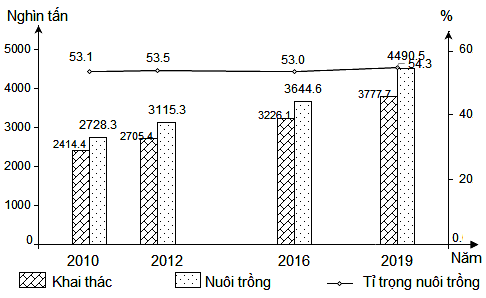 Cho biểu đồ: Tình hình phát triển ngành thủy sản nước ta, giai đoạn 2010 - 2019 Biểu đồ