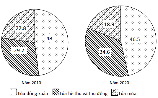 Cho biểu đồ về sản lượng lúa phân theo mùa vụ ở nước ta năm 2010 và 2020 (Đơn vị: %)