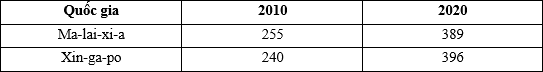 Theo bảng số liệu, nhận xét nào sau đây đúng về sự thay đổi GDP năm 2020 so với năm 2010 của Ma- lai-xi-a và Xin-ga-po?