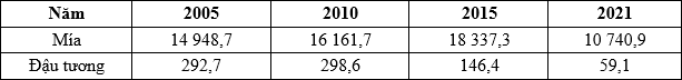 Cho bảng số liệu: SẢN LƯỢNG MÍA VÀ ĐẬU TƯƠNG CỦA NƯỚC TA GIAI ĐOẠN 2005 - 2021 (Đơn vị: