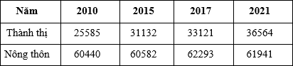 Cho bảng số liệu: DÂN SỐ THÀNH THỊ VÀ NÔNG THÔN NƯỚC TA, GIAI ĐOẠN 2010 - 2021 (Đơn vị: nghìn
