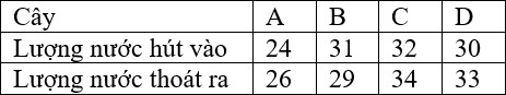 Trong 1 thí nghiệm, người ta xác định được lượng nước thoát ra và lượng nước hút vào của mỗi cây cùng một đơn vị thời gian theo bảng sau: