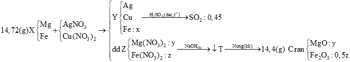 Cho 14,72 gam hỗn hợp X gồm Mg và Fe vào dung dịch chứa AgNO3 và Cu(NO3)2, khi phản ứng kết thúc
