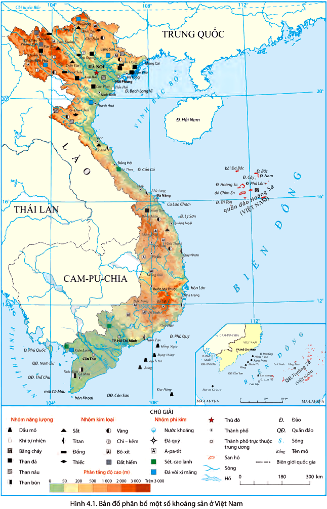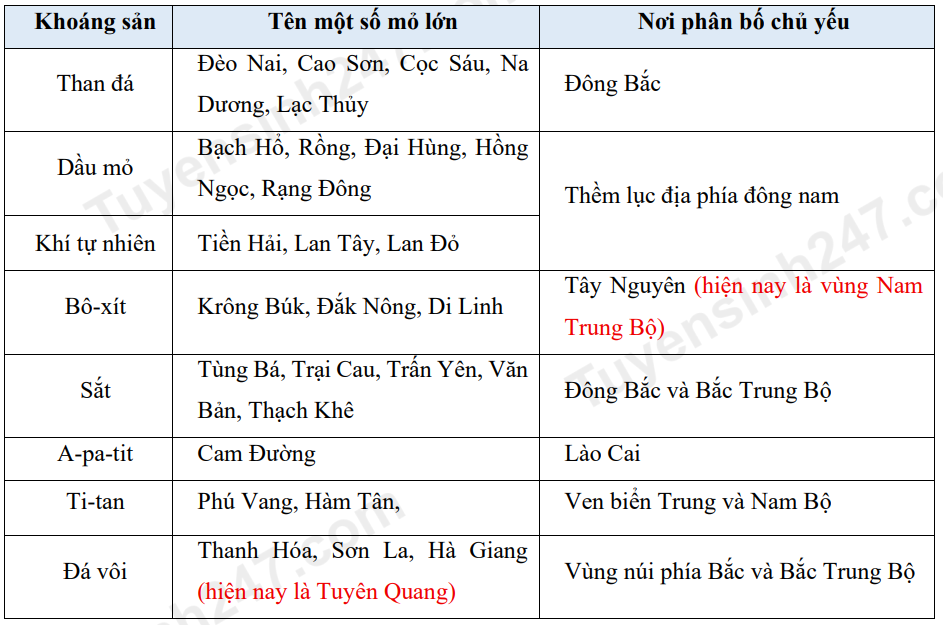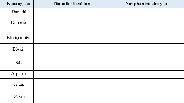 Dựa vào hình 4.1 và kiến thức đã học, em hãy xác định sự phân bố của các loại khoáng sản chủ yếu trên bản đồ và hoàn thành bảng theo mẫu sau: