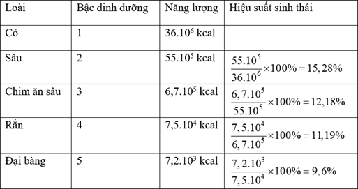 Công thức tính hiệu suất sinh thái \(H = \dfrac{{{E_n}}}{{{E_{n - 1}}}} \times 100\% \); En; En-1 là năng lượng tích luỹ ở bậc n và n-1.