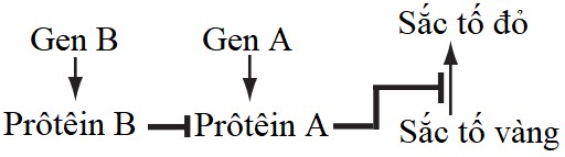 Prôtêin A ức chế sự biến đổi sắc tố vàng thành sắc tố đỏ. Prôtêin B ức chế hoạt động của prôtêin A. Các gen A và B nằm trên các NST khác nhau, các alen lặn a và b đều không tổng hợp được prôtêin.