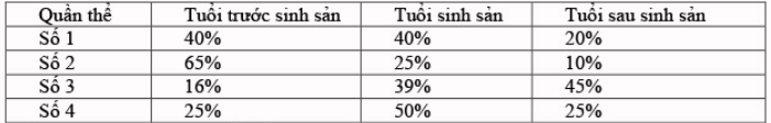 Xét 4 quần thể cùng một loài sống ở 4 hồ tự nhiên. Tỉ lệ % cá thể của mỗi nhóm ở mỗi quần thể như sau: