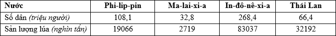 Cho bảng số liệu: SỐ DÂN, SẢN LƯỢNG LÚA CỦA MỘT SỐ NƯỚC NĂM 2018 (Nguồn: Niên giám