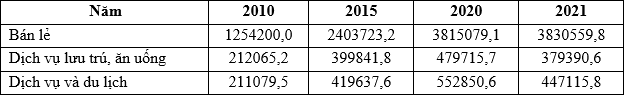 Cho bảng số liệu: HOẠT ĐỘNG NỘI THƯƠNG PHÂN THEO NGÀNH KINH DOANH NƯỚC TA GIAI ĐOẠN 2010 -