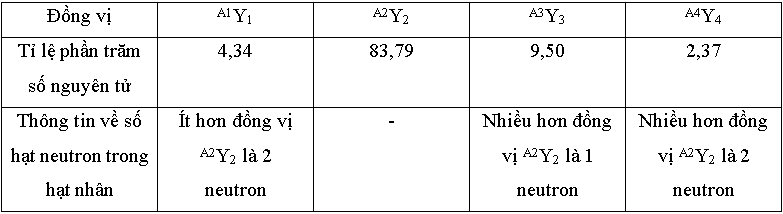 Thông tin về 4 đồng vị của nguyên tố Y được ghi nhận theo bảng sau: