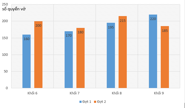 Liên đội trường \({\rm{THCSBa}}\) Đình phát động phong trào quyên góp ủng hộ vờ viết cho các bạn học sinh có hoàn cảnh khó khăn. Số vở quyên góp được qua hai đợt của các bạn đội viên khối 6, 7, 8, 9 được thống kê trong biểu đồ sau: