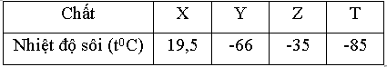 Cho bảng số liệu sau:Biết rằng mỗi chất X, Y, Z, T có thể là các chất sau: HF, HCl, HBr, HI. Các