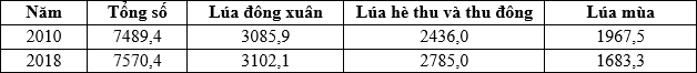 Cho bảng số liệu:DIỆN TÍCH LÚA PHÂN THEO MÙA VỤ CỦA NƯỚC TA NĂM 2010 VÀ NĂM 2018 (Đơn vị: