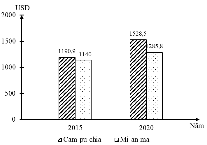 Theo biểu đồ, nhận xét nào sau đây đúng về sự thay đổi GDP bình quân đầu người năm 2020 so với năm 2015 của Cam-pu-chia và Mi-an-ma?
