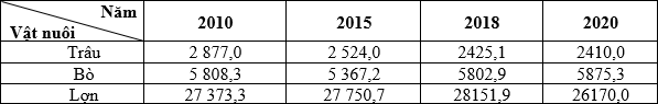 Cho bảng số liệu:SỐ LƯỢNG ĐÀN GIA SÚC CỦA NƯỚC TA GIAI ĐOẠN 2010 - 2020(Đơn vị: nghìn