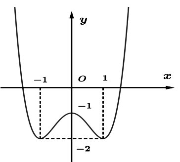 Cho hàm số \(f(x) = a{x^4} + b{x^2} + c\) có đồ thị là đường cong trong hình bên. Có bao nhiêu giá trị nguyên thuộc đoạn [-2;5] của tham số m để phương trình f(x) = m có đúng hai nghiệm phân biệt?