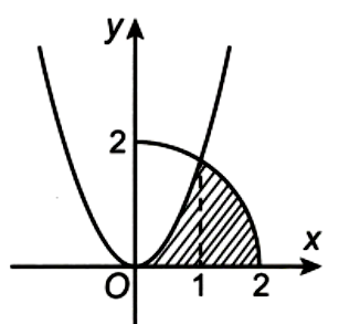 Cho (H) là hình phẳng giới hạn bởi parabol \(y = \sqrt 3 {x^2}\), cung tròn có phương trình \(y = \sqrt {4 - {x^2}} \) (với \(0 \le x \le 2\)) và trục hoành (phần tô đậm trong hình vẽ). Diện tích của (H) là