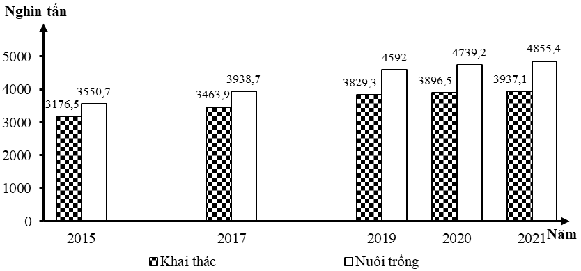 Cho biểu đồ về sản lượng thủy sản khai thác và nuôi trồng của nước ta, giai đoạn 2015 - 2021: