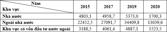 Cho bảng số liệu: DOANH THU DU LỊCH LỮ HÀNH PHÂN THEO KHU VỰC KINH TẾ CỦA NƯỚC TA, GIAI ĐOẠN