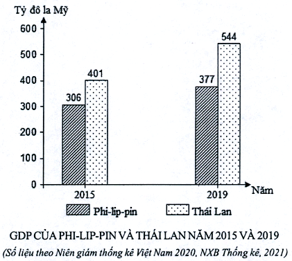 Theo biểu đồ, nhận xét nào sau đây đúng về sự thay đổi GDP năm 2019 so với năm 2015 của Phi-lip-pin và Thái Lan?