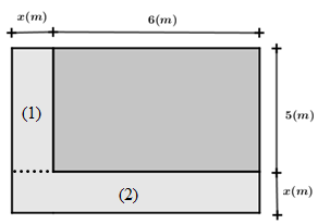 Người ta làm một lối đi theo chiều dài và chiều rộng của một hồ nước hình chữ nhật (như hình bên). Em hãy tính chiều rộng \(x\) (mét: điều kiện \(x > 0\)) của lối đi, biết rằng lối đi có diện tích bằng \(26{\mkern 1mu} {\mkern 1mu} \left( {{m^2}} \right)\).