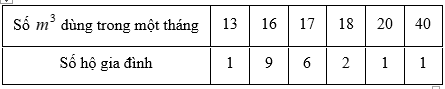 a) Lập bảng thống kê số \({{\rm{m}}^3}\) nước dùng trong một tháng của mỗi hộ gia đình.