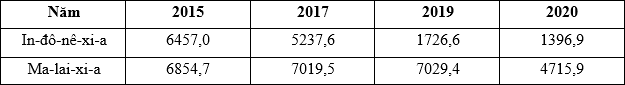 Theo bảng số liệu, cho biết nhận xét nào không đúng với sự thay đổi giá trị xuất khẩu dầu thô của In-đô-nê-xi-a và Ma-lai-xi-a, giai đoạn 2015 - 2020?